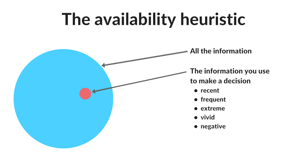 Availability Heuristic: When evaluating a specific issue, idea, method or decision, people tend to place greater value on information that comes to their mind more quickly. People give greater credence to immediate examples and tend to overestimate the probability of similar things happening in the future.