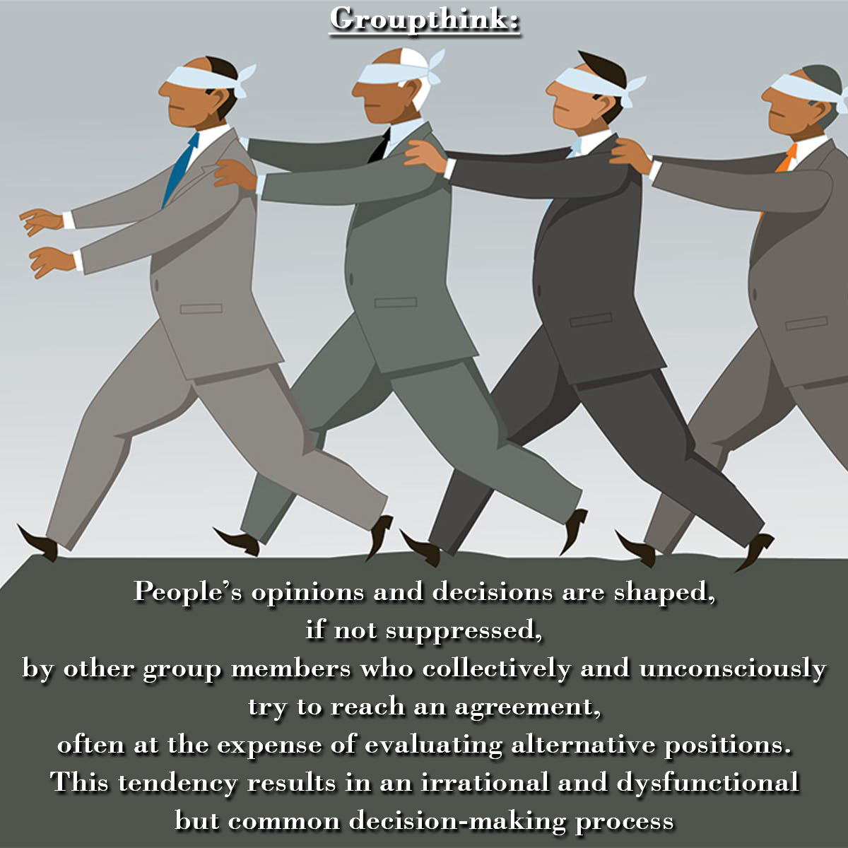 Groupthink: People’s opinions and decisions are shaped, if not suppressed, by other group members who collectively and unconsciously try to reach an agreement, often at the expense of evaluating alternative positions. This tendency results in an irrational and dysfunctional but common decision-making process.
