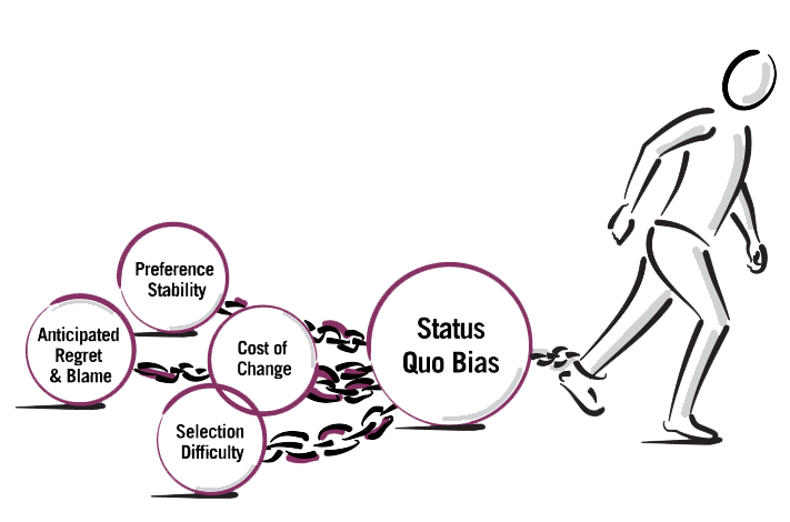 Status-Quo Bias: Generally, people prefer stability, the familiar, sticking to their routines. Therefore they tend to make decisions which guarantee that things remain more or less the same, even if they can be better, or are currently wrong. Though it makes sense not to fix something that is not broken, the problem is that many things are not even seen as broken because people don’t want to bother fixing them.