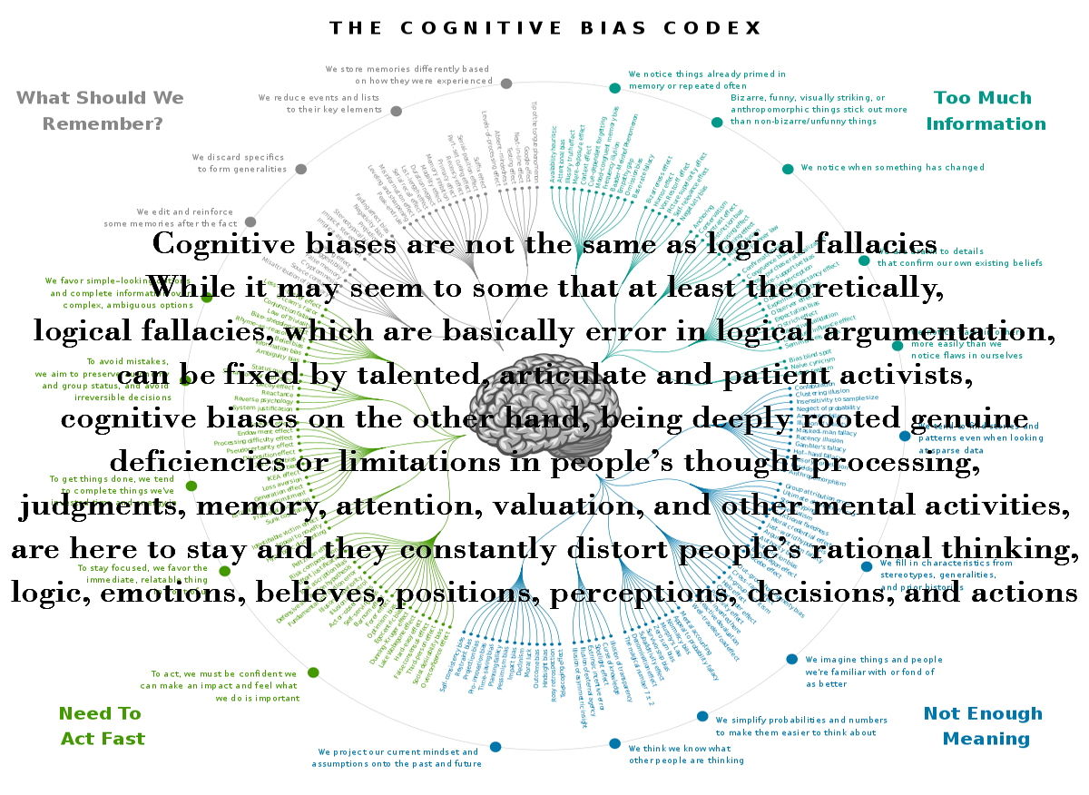 It may be worth noting that cognitive biases are not the same as logical fallacies. While it may seem to some that at least theoretically, logical fallacies, which are basically error in logical argumentation, can be fixed by talented, articulate and patient activists, cognitive biases on the other hand, being deeply rooted genuine deficiencies or limitations in people’s thought processing, judgments, memory, attention, valuation, and other mental activities, are here to stay and they constantly distort people’s rational thinking, logic, emotions, believes, positions, perceptions, decisions, and actions.