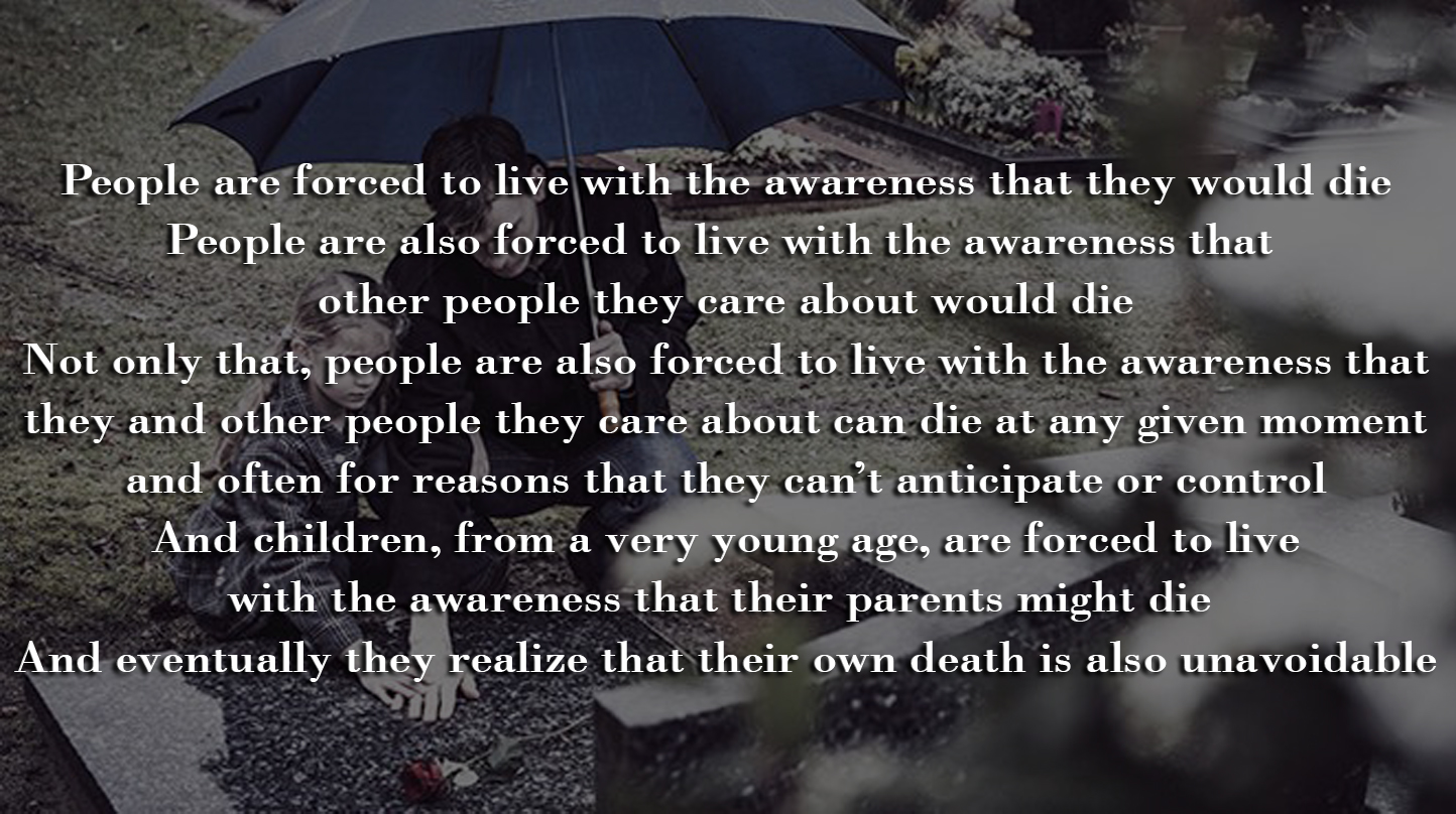 People are forced to live with the awareness that they would die. People are also forced to live with the awareness that other people they care about would die. Not only that, people are also forced to live with the awareness that they and other people they care about can die at any given moment, and often for reasons that they can’t anticipate or control.