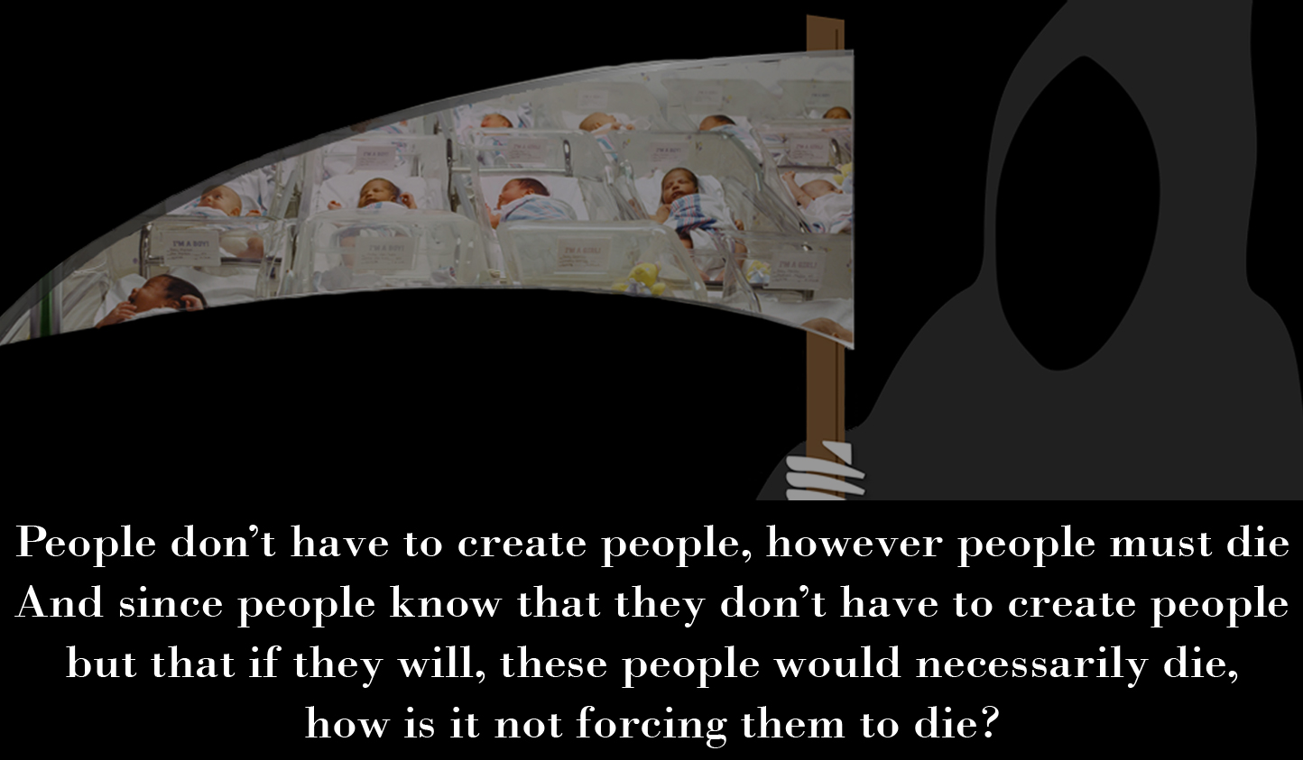 People don’t have to create people, however people have to die. And since people know that they don’t have to create people but that if they will, the people they are creating have to die, how is it not forcing them to die?