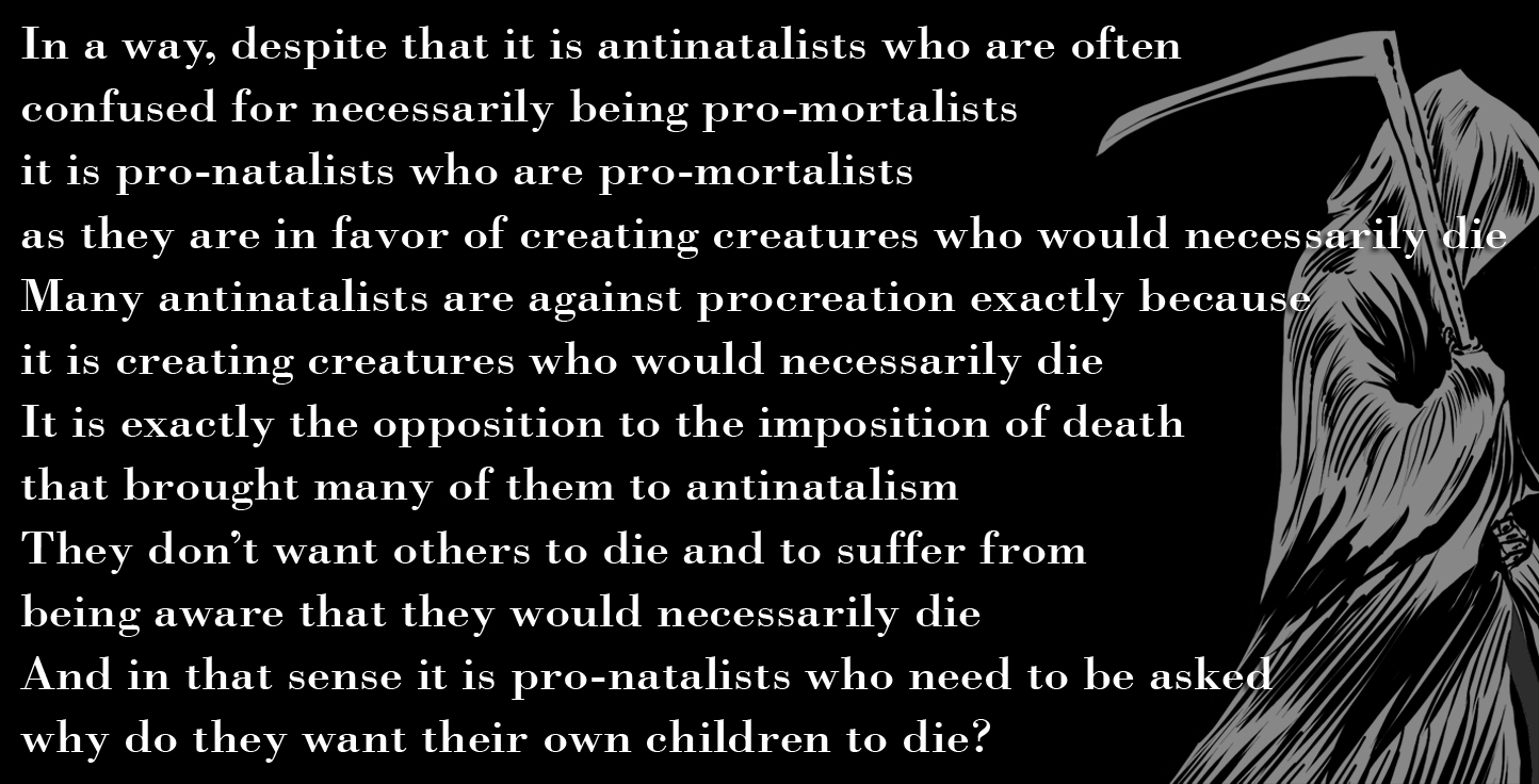 Antinatalist: But before your child was created it didn’t exist, you have created your child. There was no one and then you have decided to create someone. And that someone has to die. Your child wouldn’t have to die had you never created it. Your child didn’t have to live, there was no one there who had to live or die before you decided to create it, and now that you did, it has to die. So again, why do you want your children to die?
