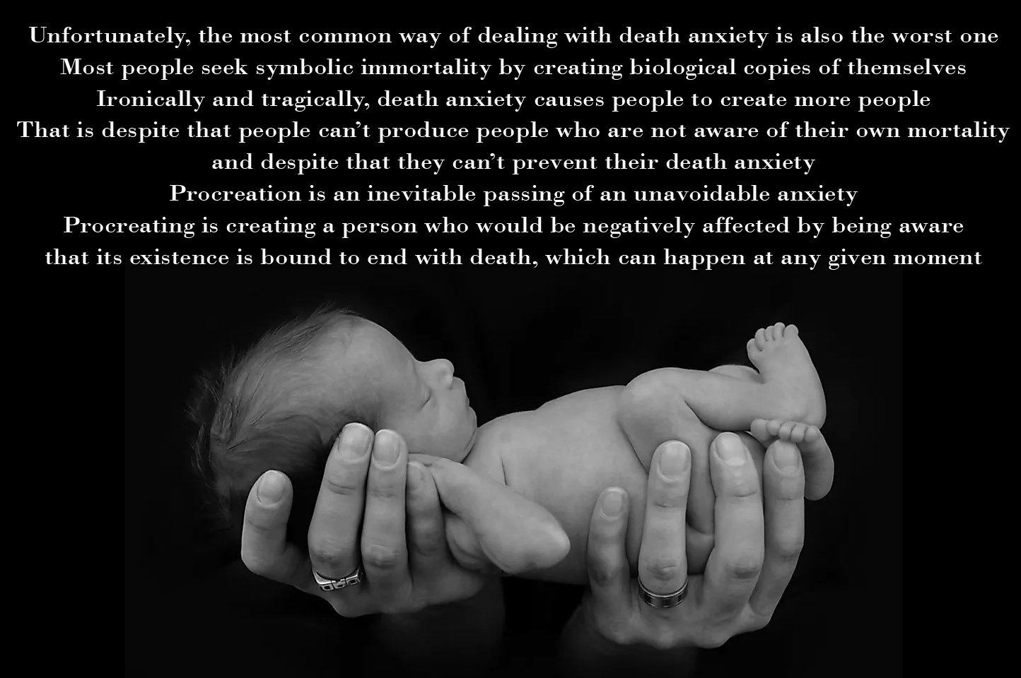 Ironically and tragically, death anxiety causes people to create more people. That is despite that people can’t produce people who are not aware of their own mortality, and despite that they can’t prevent their death anxiety. Procreation is an inevitable passing of unavoidable anxiety.