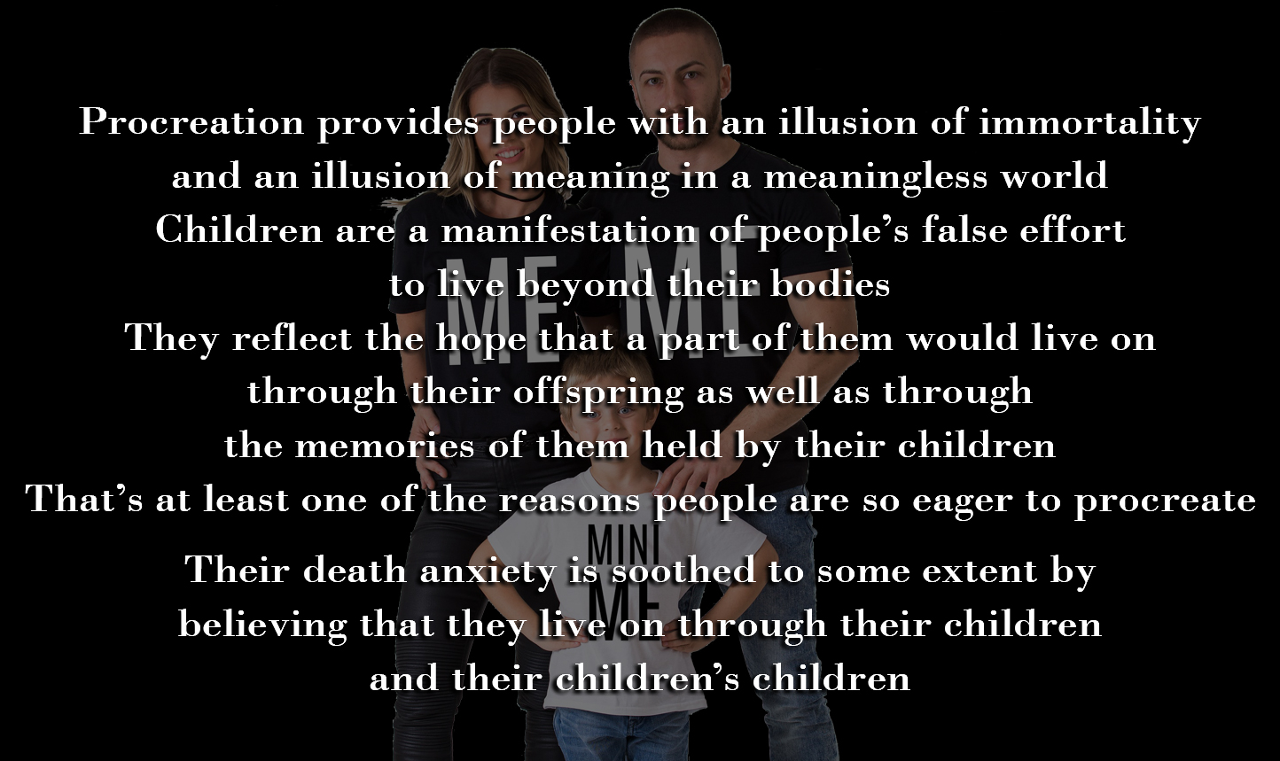 Even if you don’t agree with every part of Becker’s theory, procreation surly is at least partly a result of death anxiety. Procreation provides people with an illusion of immortality and an illusion of meaning in a meaningless world.