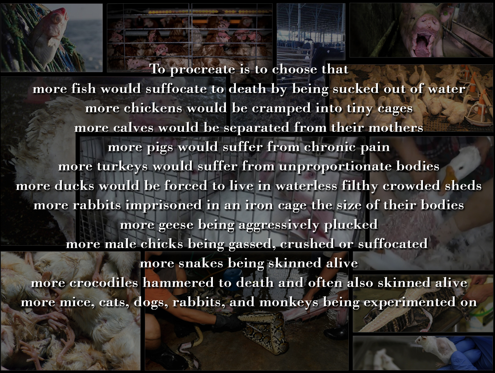 Every person has to eat, and every food has a price. Unfortunately, most people are choosing the ones with the highest price – animal based foods. Therefore in most cases procreating is choosing that more fish would suffocate to death by being violently sucked out of water, that more chickens would be cramped into tiny cages with each forced to live in a space the size of an A4 paper, that more calves would be separated from their mothers, and more cow mothers would be left traumatized by the abduction of their babies, it is choosing more pigs who suffer from chronic pain, more lame sheep, more beaten goats, more turkeys who can barely stand as a result of their unproportionate bodies, more ducks who are forced to live out of water and in filthy crowded sheds, more rabbits imprisoned in an iron cage the size of their bodies, more geese being aggressively plucked, more male chicks being gassed, crushed or suffocated since they are unexploitable for eggs nor meat, more snakes being skinned alive, and more crocodiles and alligators being hammered to death and often also skinned alive to be worn, and more mice, cats, dogs, fish, rabbits, and monkeys being experimented on.