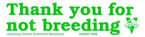 Under Are some people opposed to VHEMT? they write that: “At first glance, some people assume that VHEMT Volunteers and Supporters must hate people and that we want everyone to commit suicide or become victims of mass murder. It’s easy to forget that another way to bring about a reduction in our numbers is to simply stop making more of us. Making babies seems to be a blind spot in our outlooks on life.”