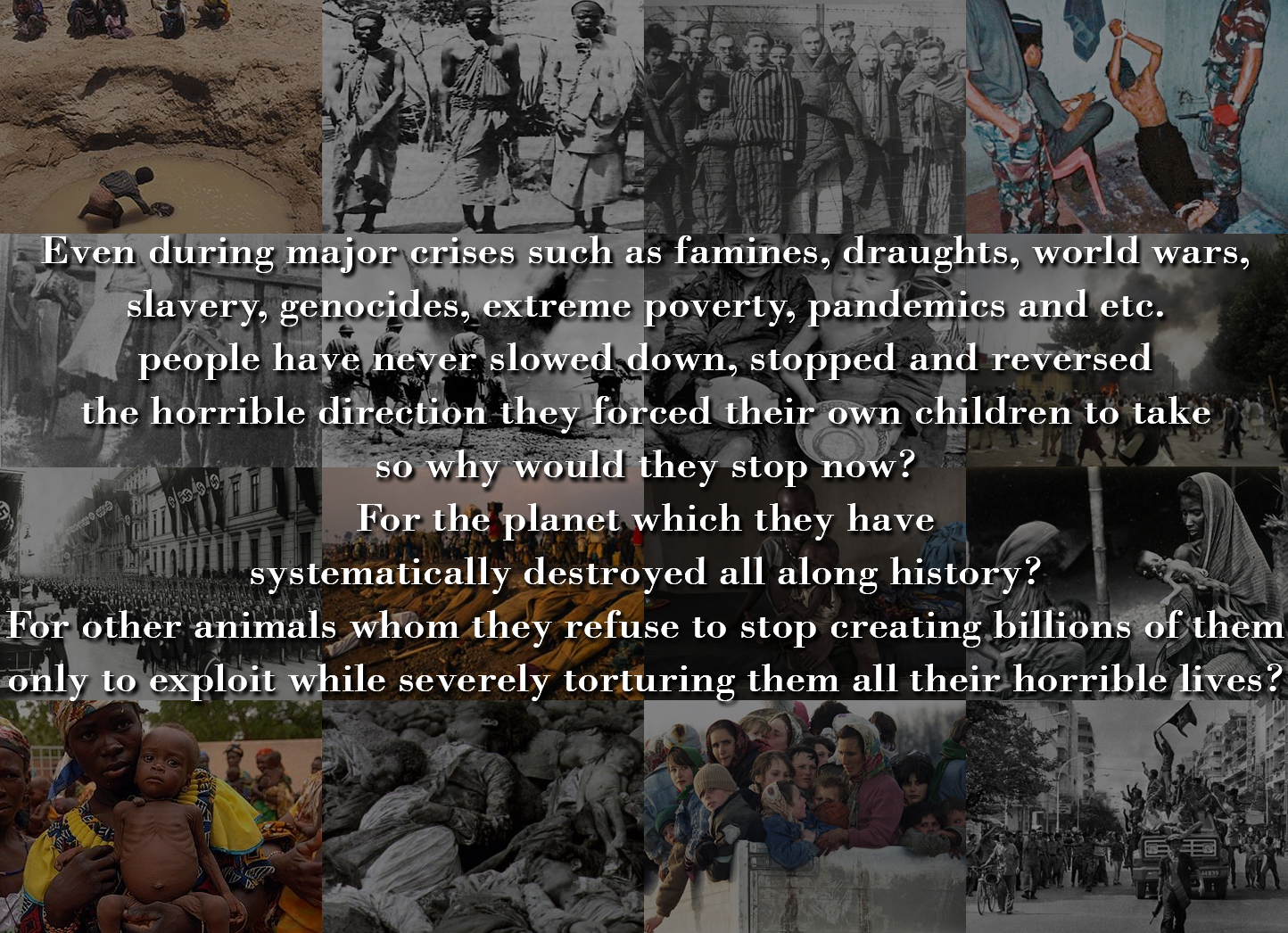 It is not that humanity never have, it is that it always did the opposite, and that does mean it never will. Even during major crises such as famines, draughts, world wars, slavery, genocides, extreme poverty, pandemics, and etc. people have never slowed down, stopped and reversed the horrible direction they forced their own children to take, so why would they stop now? For the planet which they have systematically destroyed all along history? For other animals whom they refuse to stop creating billions of them only to exploit while severely torturing them all their horrible lives?