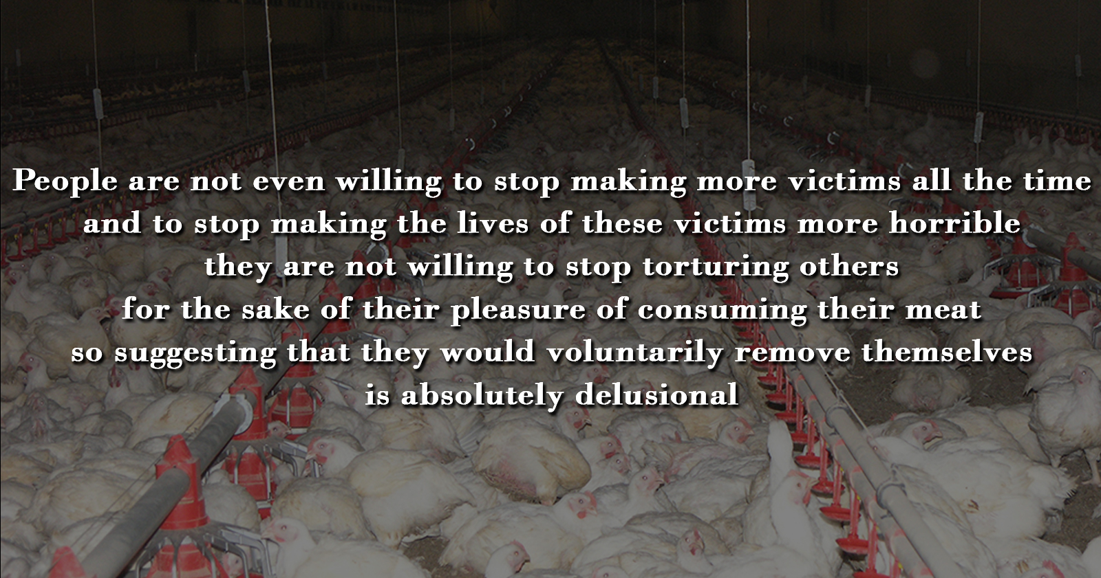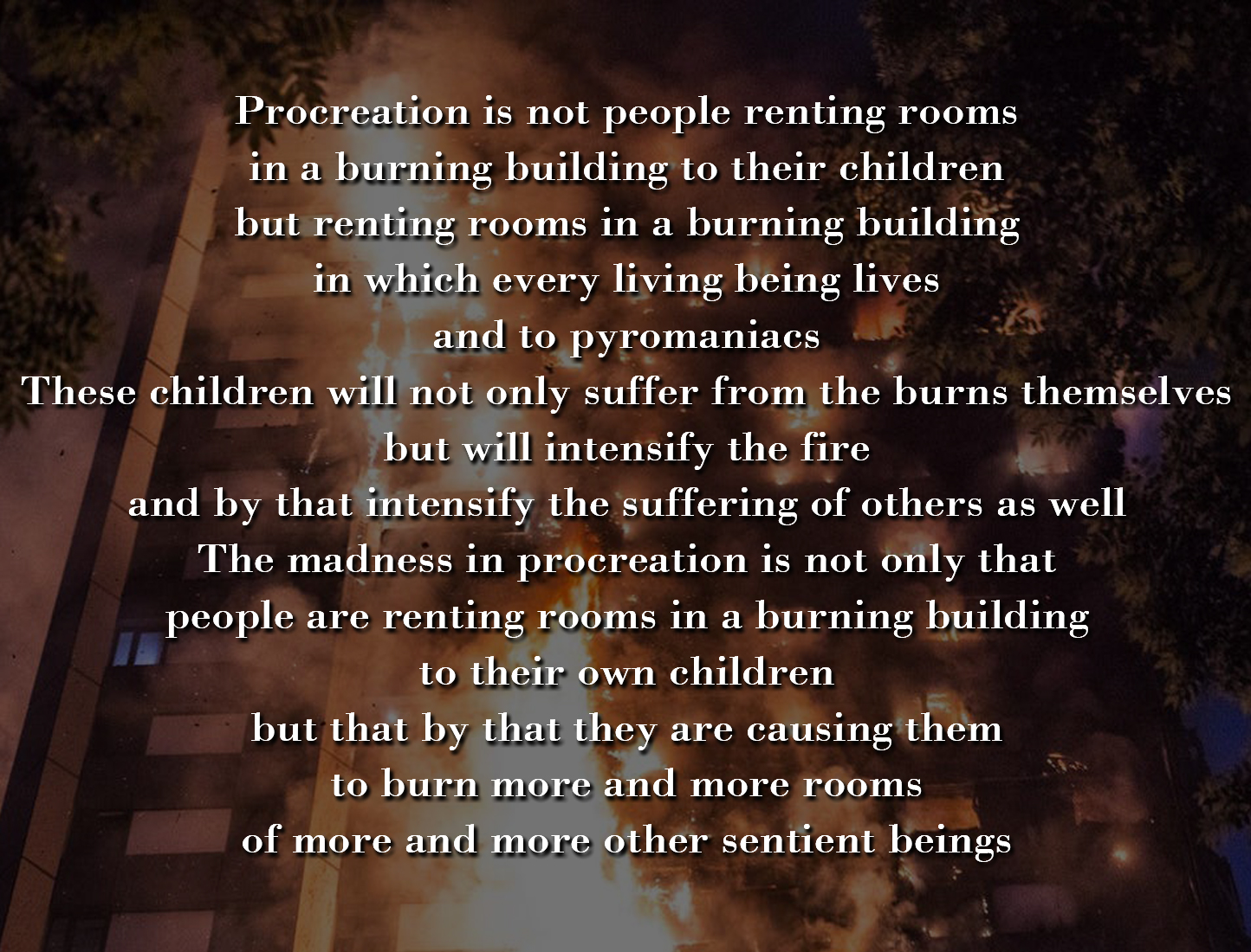 While interesting and very powerful, this analogy is also very partial. It is not accurate to say that we are renting rooms in a burning building to our children, but that we are renting rooms in a burning building in which every living being lives, and to pyromaniacs. These children will not only suffer from the burns themselves but will intensify the fire and by that intensify the suffering of others as well. The madness in procreation is not only that people are renting rooms in a burning building to their own children, but that by that they are causing them to burn more and more rooms of more and more other sentient beings. The aim of this comment is not to niggle but to point out a very important aspect of the issue, since the more complete version of this analogy makes human extinction much more urgent. In fact so urgent that it can’t allow itself to wait for humans to do it voluntarily.