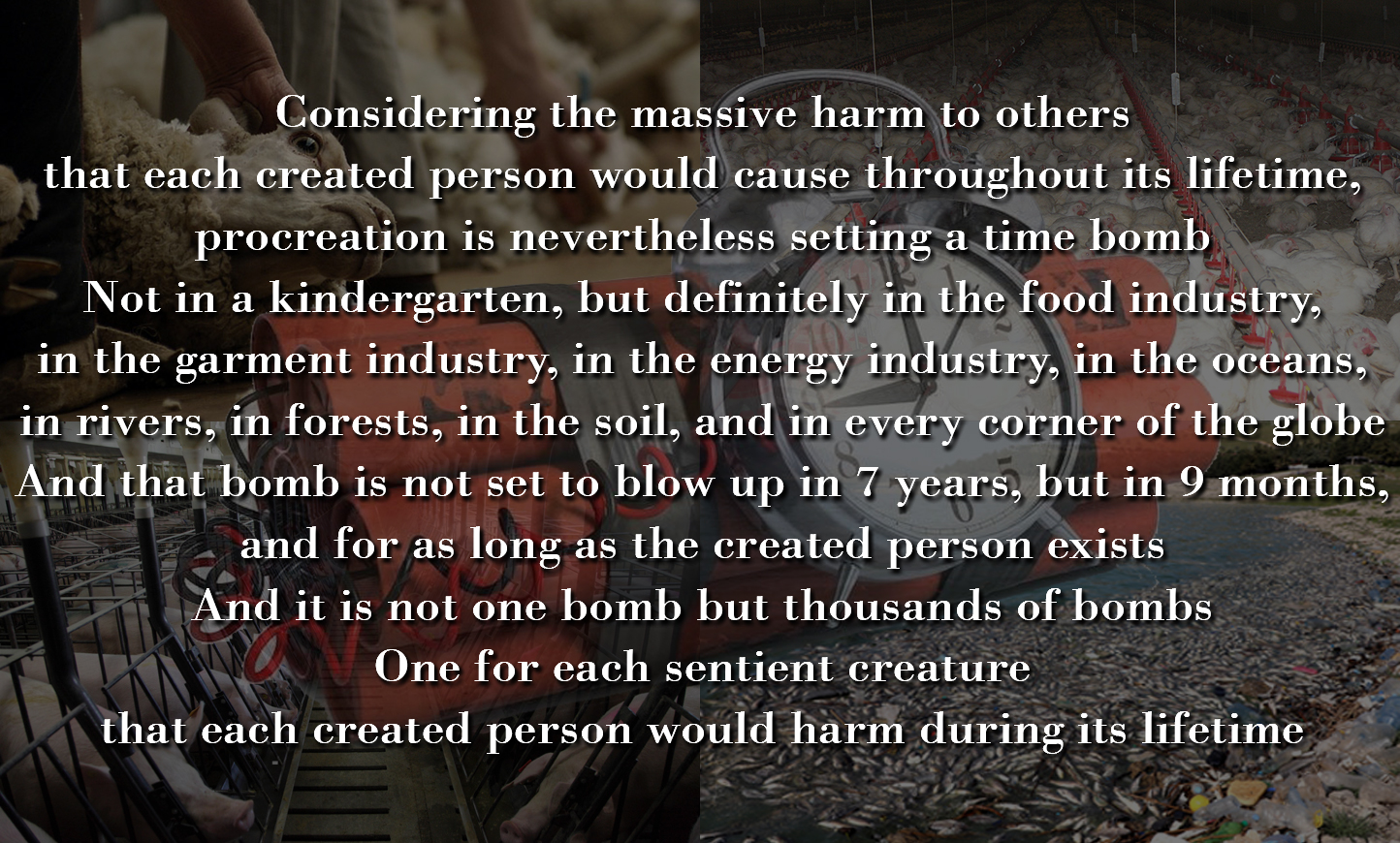 But actually a ticking bomb is analogical to procreation. That is because considering the massive harm to others that each created person would cause throughout its lifetime, each person is actually a living set of numerous bombs. And therefore procreation is nevertheless setting a time bomb. Not in a kindergarten, but definitely in the food industry, in the garment industry, in the energy industry, in the oceans, in rivers, in forests, in the atmosphere, in the soil, underground, and in every corner of the globe. And that bomb is not set to blow up 7 years from the time the action took place, but after 9 months, and for as long as the created person exists. And it is not one bomb but thousands of bombs, for the thousands of sentient creatures each created person would harm during its lifetime.
