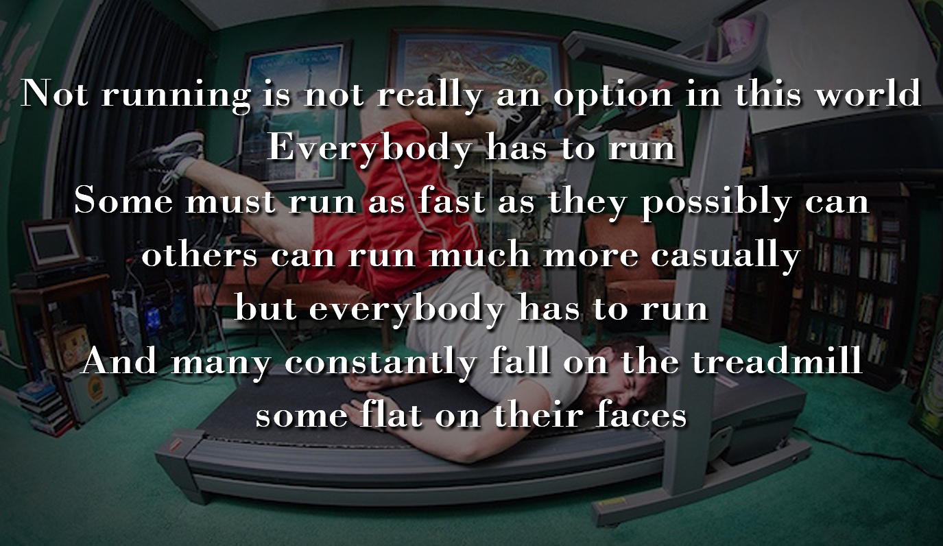 Not running is not really an option in this world. Everybody has to run. Some must run as fast as they possibly can, while others can run much more casually, but everybody needs to run. And tragically, despite that most people run because they want to someday stop, most of them can never stop. Usually it is because they have children to care for, for some it is other family members who need assistance, for others it is health issues, accidents or any other disaster that comes their way and forces them to keep running, and some can’t stop running for psychological reasons such as the feeling that idleness would drive them nuts more than keep running, or because they are so used to running that they have no idea how to stop. And of course many constantly fall on the treadmill, some flat on their faces.