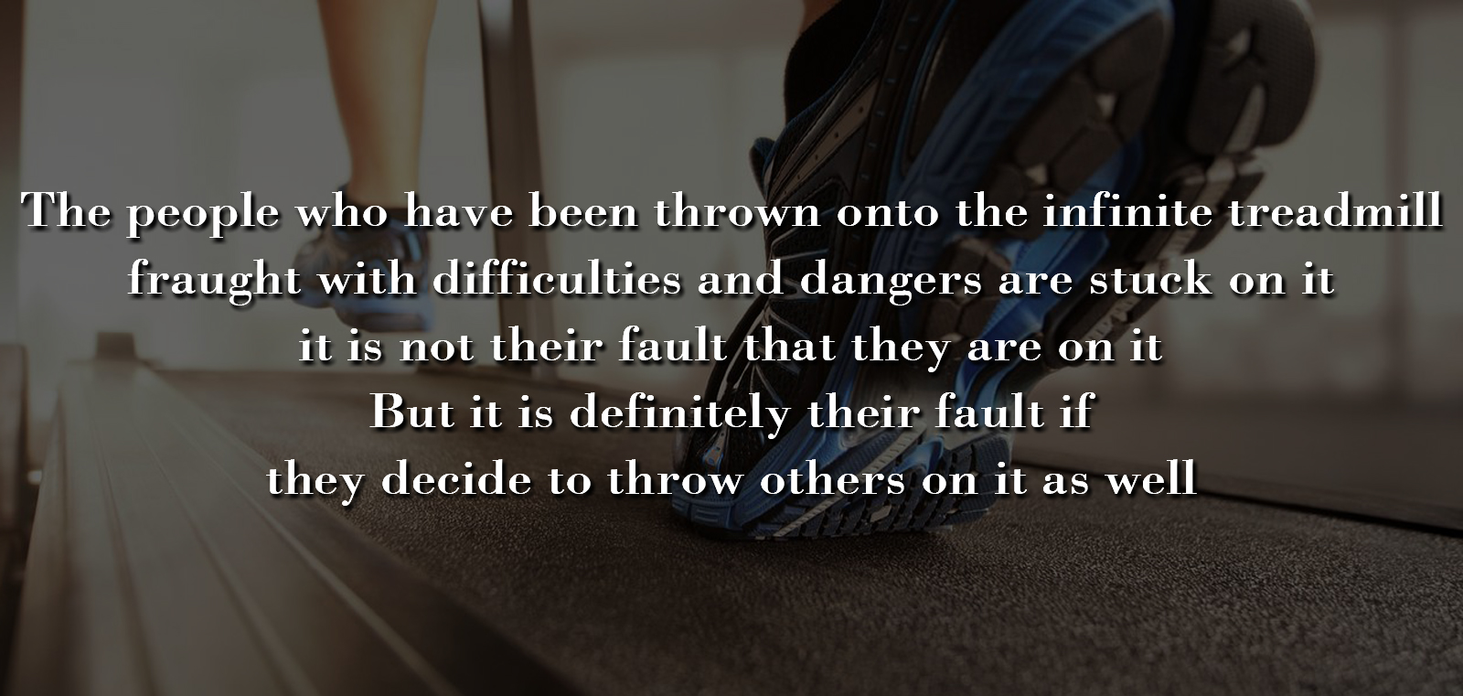 The people who have been thrown onto the infinite treadmill fraught with difficulties and dangers are stuck on it, it is not their fault that they are on it. But it is definitely their fault if they decide to throw others on it as well.