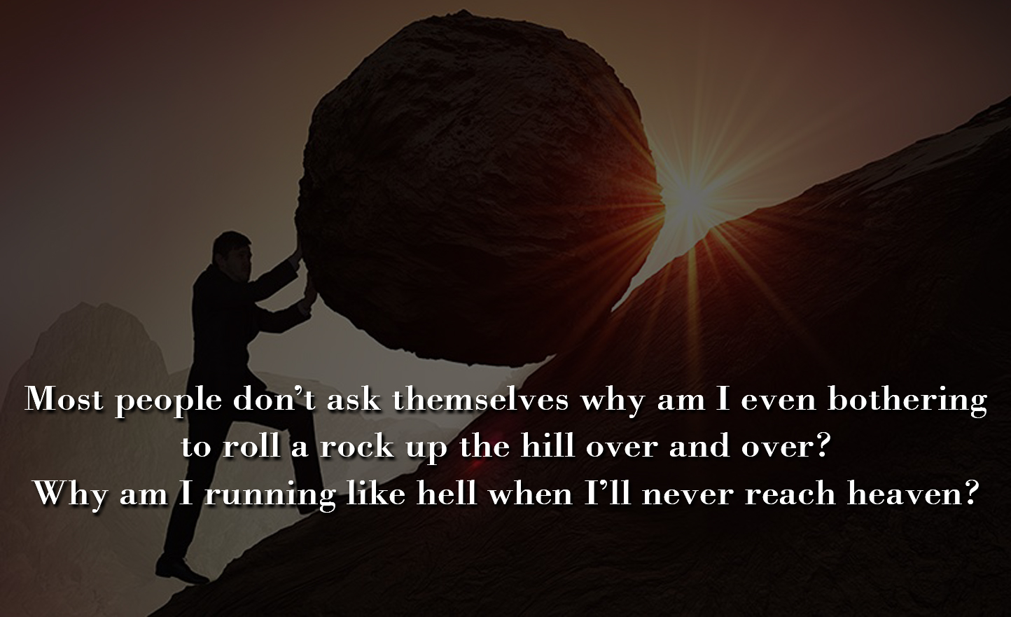 But that rarely happens. Most people don’t ask themselves why am I even bothering to roll a rock up the hill over and over? Why am I running like hell when I’ll never reach heaven?