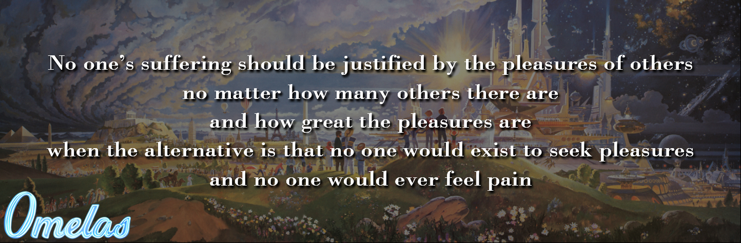 No one’s suffering should be justified by the pleasures of others, no matter how many others there are, and how great the pleasures are, when the alternative is that no one would exist to seek pleasures and no one would ever feel pain.
