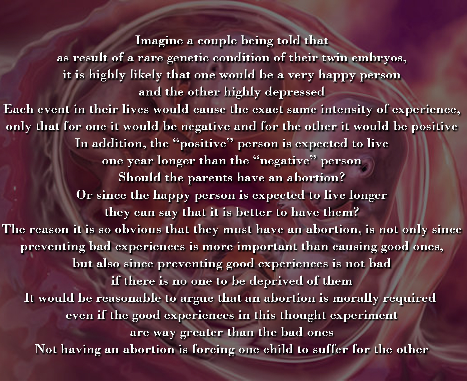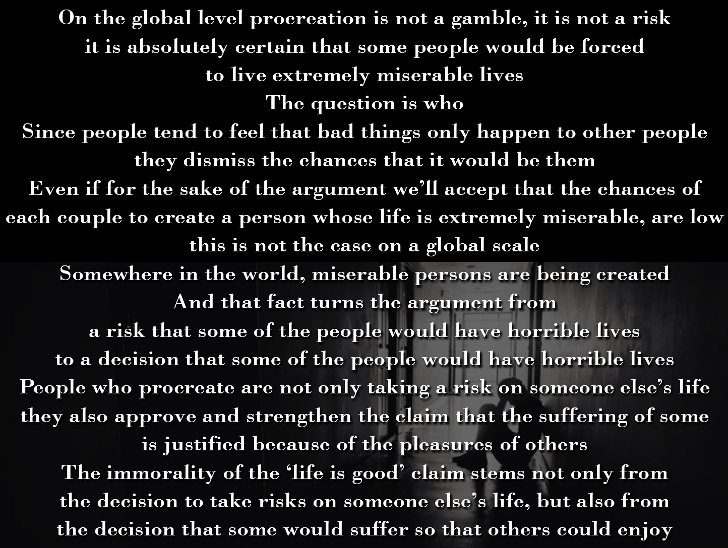 Even if for the sake of the argument I’ll accept the claim that someone’s pains are justified by that someone’s pleasures, it is not the only thing pro-natalists are actually saying here. Given that lives not worth living are being created all the time, what they are actually saying is that some’s suffering is justified by the pleasures of others. And that’s a whole different level of moral wrongfulness.