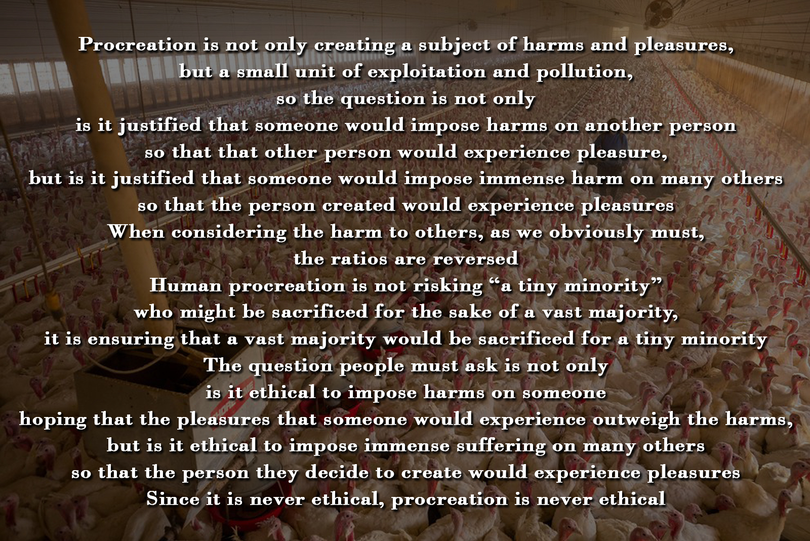 But of course, this discussion is substantially partial. Procreation is not only creating a subject of harms and pleasures, but a small unit of exploitation and pollution, so the question is not is it justified that someone would impose harms on another person so that that other person would experience pleasure, but is it justified that someone would impose immense harm on many others so that the person created would experience pleasures.