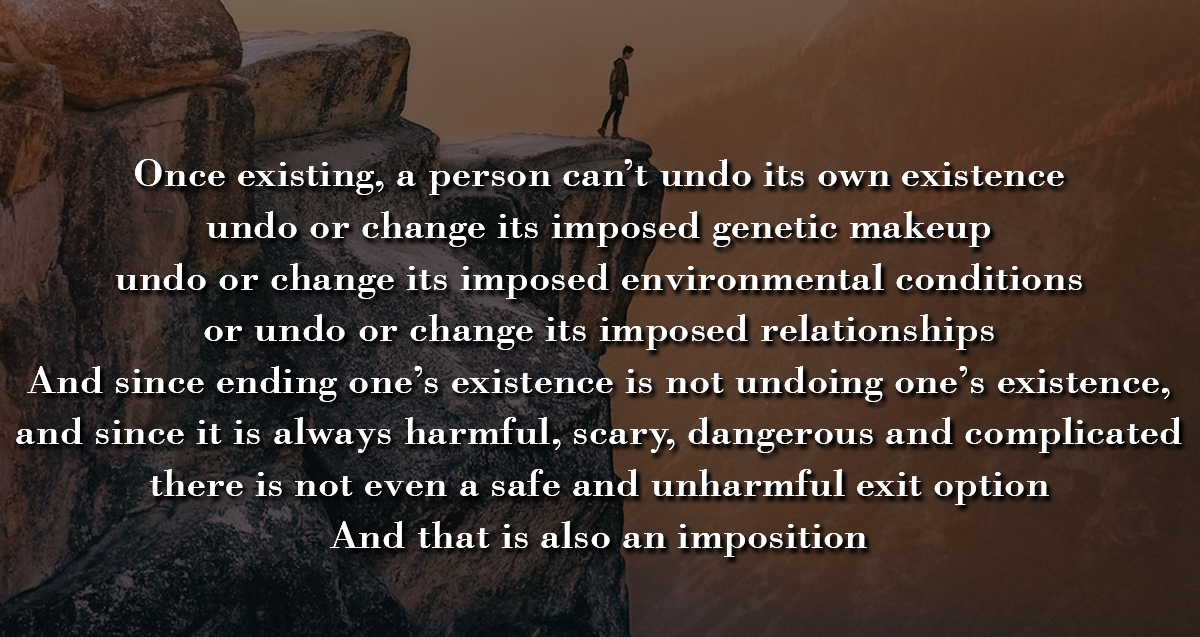 Once existing, a person can’t undo its own existence, undo or change the genetic makeup forced on that person, undo or change the environmental conditions forced on that person, or undo or change the relationships forced on that person.
