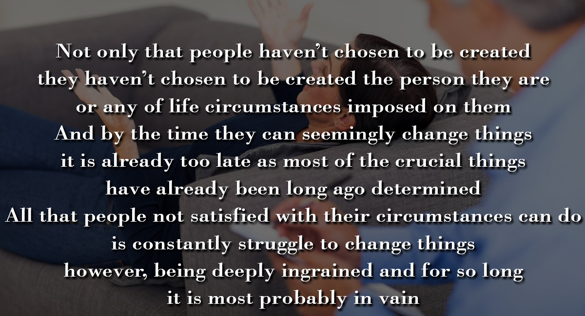 Numerous people are stuck in situations which were imposed on them. From abusive parents, abusive environment, innate medical conditions, effects of medical malpractice, undesired personality tendencies, negative mental and psychological conditions and etc., all have crucial impact on the created person and none were chosen by the created person. Not only haven’t we chosen to be created, we haven’t chosen to be created the person we are, in the life circumstances imposed on us. And by the time we can seemingly change that, it is already too late as most of the crucial things (if not the most crucial things) have already been long ago determined, and all that the people who are not satisfied with their share are left with, is constantly, but probably vainly, struggle to change things that so long ago and so deeply have designed their very selves.