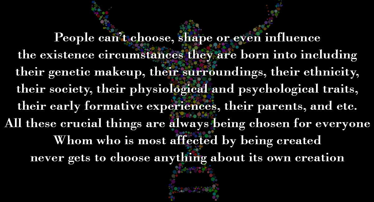 While the consent argument mostly focuses on that creating people is subjecting them to harms without their consent – and is therefore an imposition of harms, the argument I am making here focuses on that creating people is subjecting them to a wide but very specific set of extremely crucial formative conditions that will constitute their very existence, yet none of them were chosen by the created people, and it is highly doubtful whether their constituting effect could ever be radically altered – and therefore an imposition of circumstances of existence.