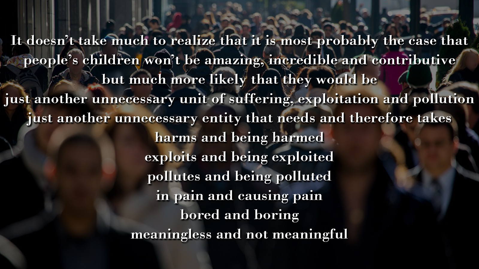 Even just a bit of rational and realistic speculation would infer that it is most probably the case that people’s children won’t be amazing, incredible and contributive, and that it is not important that they would exist because they would have a positive meaningful impact on the ones who already exist, and that it is so much more likely that they would be just another unnecessary unit of suffering, exploitation and pollution, just another unnecessary entity that needs and therefore takes, harms and being harmed, exploits and being exploited, pollutes and being polluted, in pain and causing pain, bored and boring, meaningless and not meaningful.